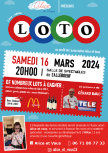 L’association Alice & Vous organise un loto Samedi 16 mars 2024, 20h Salle Rosa Bonheur, Salleboeuf De nombreux lots à gagner ! Tous les bénéfices