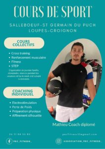 L’Association Pec Fitness reprend ses cours de sport individuels et collectifs à compter du : 12 septembre 2023 avec Mathieu, coach diplômé. Programme des cours