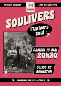 SOULIVERS, l’Univers Soul Samedi 13 mai, 20h30 Eglise de Bonnetan Prenez 1 zeste de pianiste chanteur,1 pincée de percussionniste chanteur, 7 grains de voix uniques