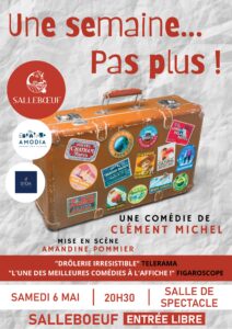 Venez assister à une pièce de théâtre surnommée » drôlerie irrésistible « selon Télérama. » Une semaine pas plus » est une comédie de Clément Michel, mise