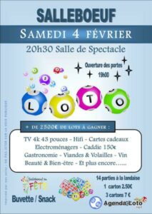 Samedi 4 février 20h30, venez participer au tout 1er loto de Salleboeuf en fête ! Plus de 2500€ de lots à gagner 🎁🎁🎁 ⏱Salle de