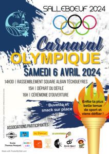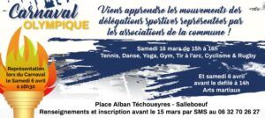 Nous vous convions au carnaval de notre village qui se déroulera le : Samedi 6 avril. Le thème de cette année : Les jeux olympiques
